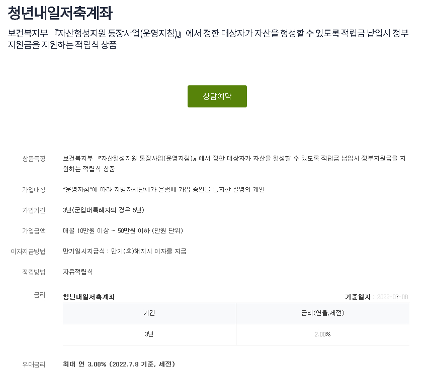 보건복지부 『자산형성지원 통장사업(운영지침)』에서 정한 대상자가 자산을 형성할 수 있도록 적립금 납입시 정부지원금을 지원하는 적립식 상품